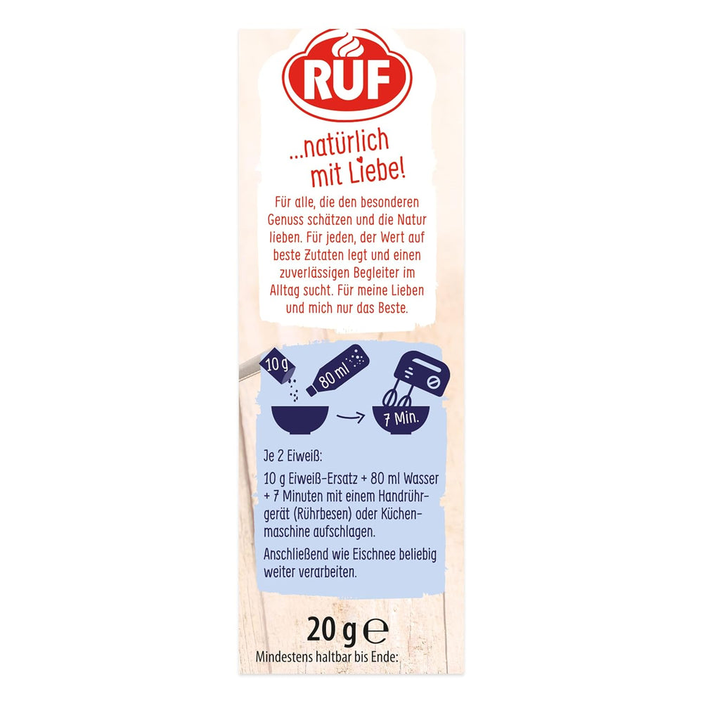 RUF Bio Veganer Eiweiß-Ersatz ist die pflanzliche BIO-Alternative zu Eiweiß für vegane Köche und alle, die in Rezepten auf Eier oder Gluten verzichten möchten. Ein 20-g-Beutel entspricht etwa vier Eiweißen und bietet die gleiche Schaum- und Absorptionsfunktion in Desserts und Gebäck.